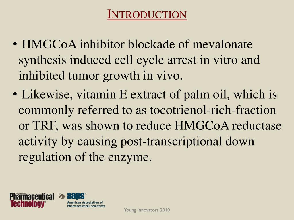 Introduction • HMGCoA inhibitor blockade of mevalonate synthesis induced cell cycle arrest in vitro and inhibited tumor growth in vivo. • Likewise, vitamin E extract of palm oil, which is commonly referred to as tocotrienol-rich-fraction or TRF, was shown to reduce HMGCoAreductase activity by causing post-transcriptional down regulation of the enzyme. Young Innovators 2010