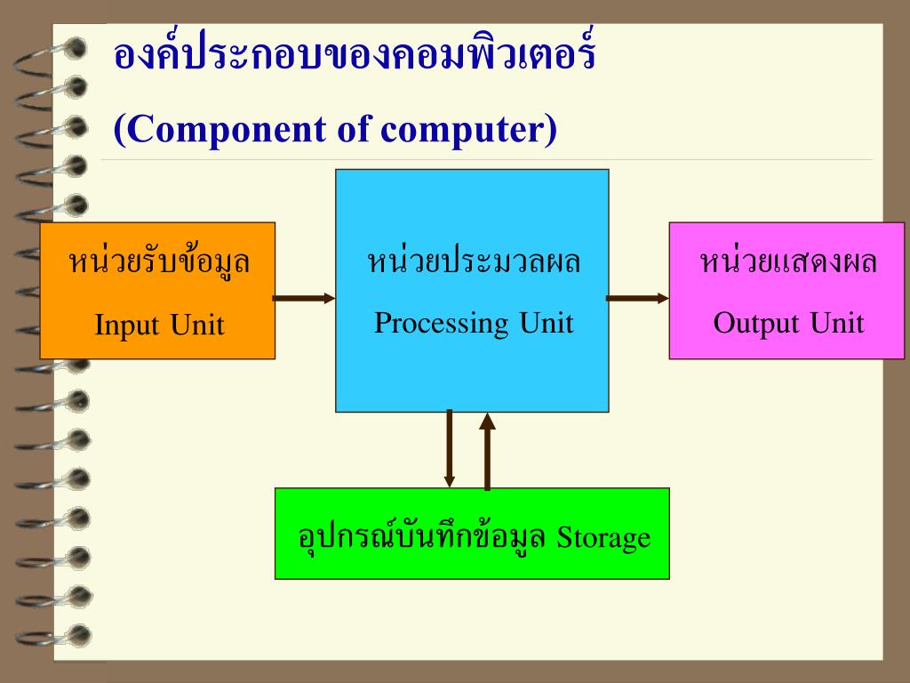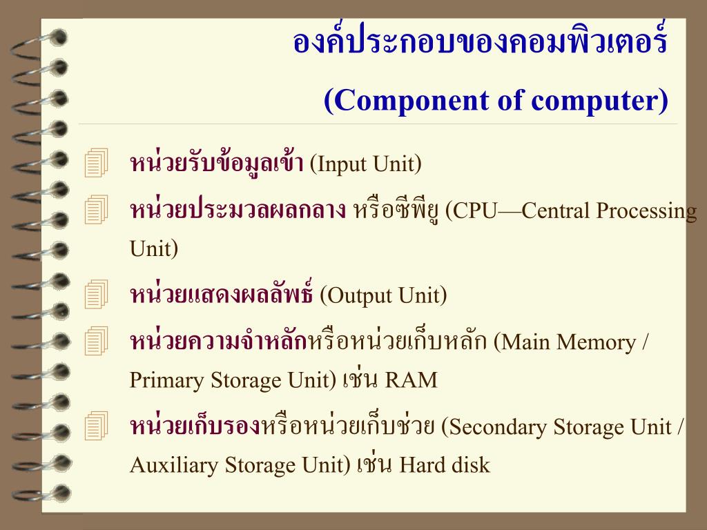 องค์ประกอบของคอมพิวเตอร์(Component of computer) • หน่วยรับข้อมูลเข้า (Input Unit) • หน่วยประมวลผลกลาง หรือซีพียู (CPU—Central Processing Unit) • หน่วยแสดงผลลัพธ์ (Output Unit) • หน่วยความจำหลักหรือหน่วยเก็บหลัก (Main Memory / Primary Storage Unit) เช่น RAM • หน่วยเก็บรองหรือหน่วยเก็บช่วย (Secondary Storage Unit / Auxiliary Storage Unit) เช่น Hard disk
