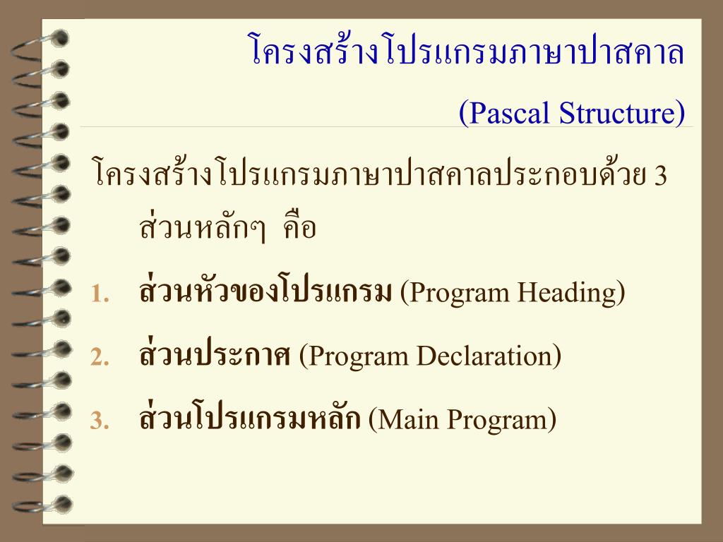 โครงสร้างโปรแกรมภาษาปาสคาล(Pascal Structure) โครงสร้างโปรแกรมภาษาปาสคาลประกอบด้วย 3 ส่วนหลักๆ คือ • ส่วนหัวของโปรแกรม(Program Heading) • ส่วนประกาศ (Program Declaration) • ส่วนโปรแกรมหลัก (Main Program)