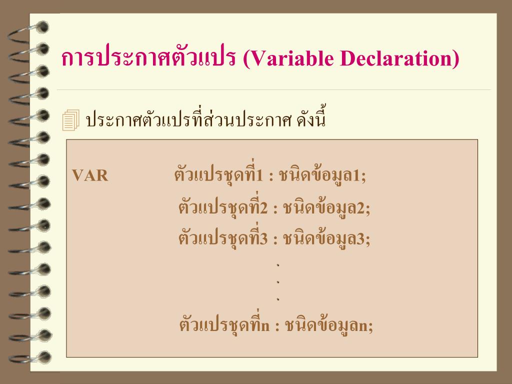 การประกาศตัวแปร (Variable Declaration) • ประกาศตัวแปรที่ส่วนประกาศดังนี้ VARตัวแปรชุดที่1 : ชนิดข้อมูล1; ตัวแปรชุดที่2 : ชนิดข้อมูล2; ตัวแปรชุดที่3 : ชนิดข้อมูล3; . . . ตัวแปรชุดที่n: ชนิดข้อมูลn;