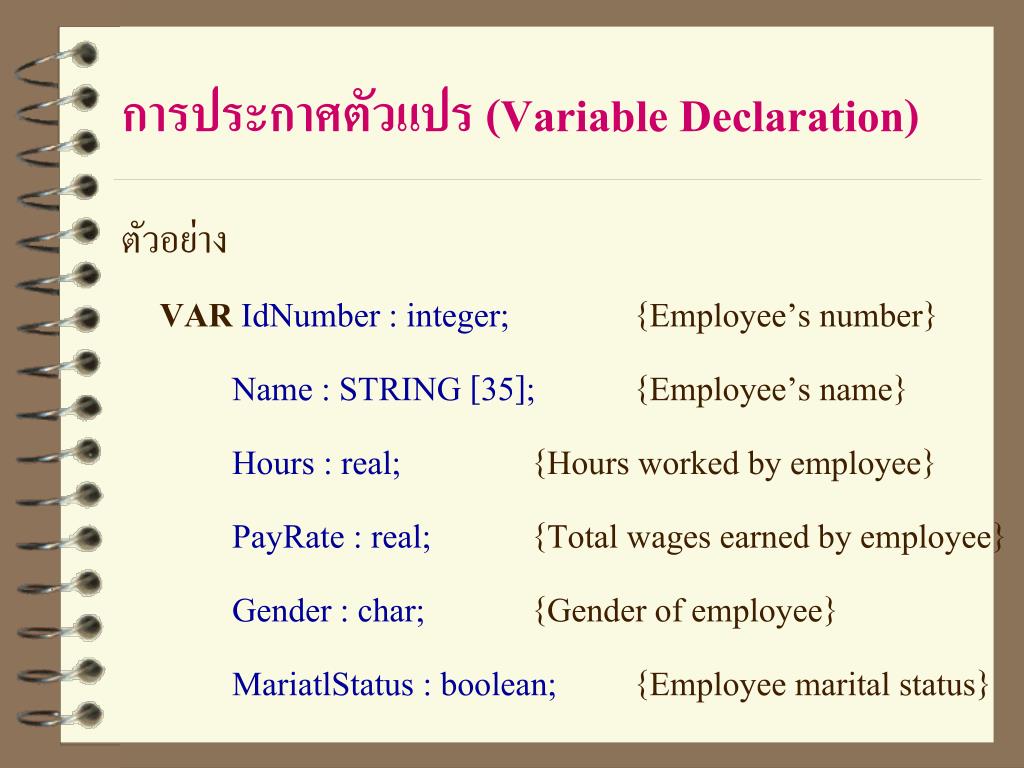 การประกาศตัวแปร (Variable Declaration) ตัวอย่าง VARIdNumber : integer; {Employee’s number} Name : STRING [35]; {Employee’s name} Hours : real; {Hours worked by employee} PayRate : real; {Total wages earned by employee} Gender : char; {Gender of employee} MariatlStatus : boolean; {Employee marital status}