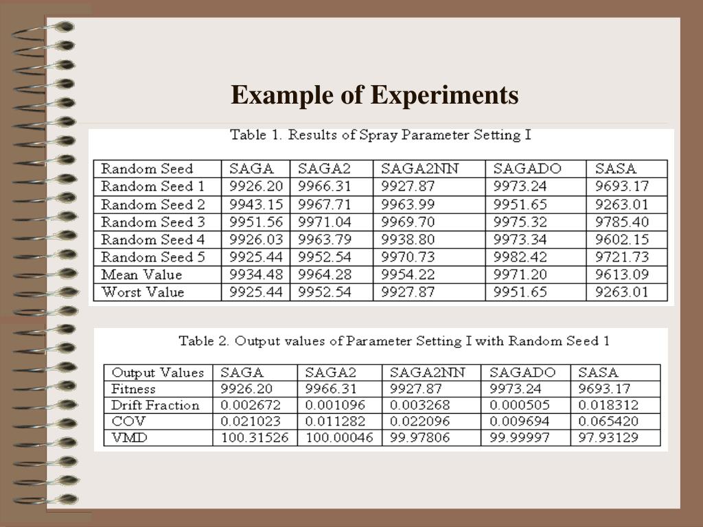 Aerial Spray Deposition Problem • AGDISP (Agricultural Dispersal) aerial spray simulation model predicts the deposition of spray material released from an aircraft. • The prediction is based on a set of spray parameter values. The total combination of possible spray parameters generates a huge search space (NP hard). • AGDISP returns three spray output values: VMD (the deposition composed of Volume Median Diameter), drift fraction, and COV (the Coefficient of Variance). • The goal is to minimize the difference between the output VMD and the desired VMD, minimize the drift fraction, and minimize the COV.
