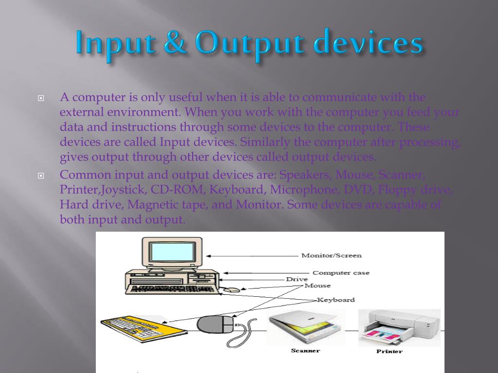 Input & Output devices • A computer is only useful when it is able to communicate with the external environment. When you work with the computer you feed your data and instructions through some devices to the computer. These devices are called Input devices. Similarly the computer after processing, gives output through other devices called output devices. • Common input and output devices are: Speakers, Mouse, Scanner, Printer,Joystick, CD-ROM, Keyboard, Microphone, DVD, Floppy drive, Hard drive, Magnetic tape, and Monitor. Some devices are capable of both input and output.