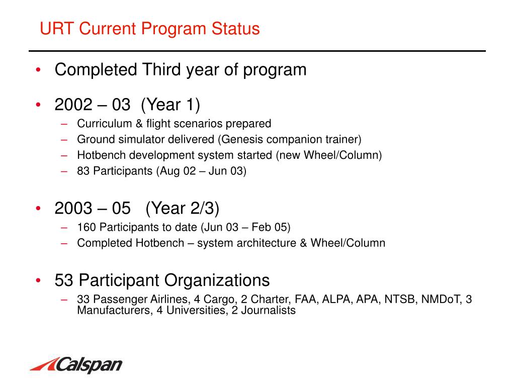 URT Current Program Status • Completed Third year of program • 2002 – 03 (Year 1) • Curriculum & flight scenarios prepared • Ground simulator delivered (Genesis companion trainer) • Hotbench development system started (new Wheel/Column) • 83 Participants (Aug 02 – Jun 03) • 2003 – 05 (Year 2/3) • 160 Participants to date (Jun 03 – Feb 05) • Completed Hotbench – system architecture & Wheel/Column • 53 Participant Organizations • 33 Passenger Airlines, 4 Cargo, 2 Charter, FAA, ALPA, APA, NTSB, NMDoT, 3 Manufacturers, 4 Universities, 2 Journalists