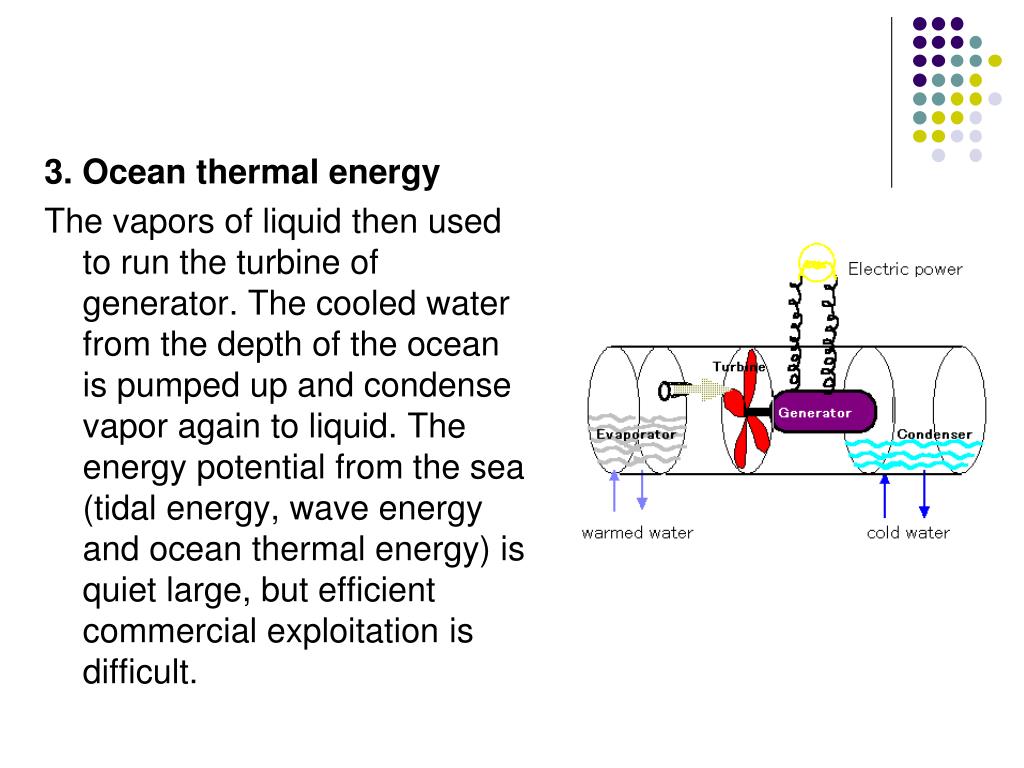 3. Ocean thermal energy The vapors of liquid then used to run the turbine of generator. The cooled water from the depth of the ocean is pumped up and condense vapor again to liquid. The energy potential from the sea (tidal energy, wave energy and ocean thermal energy) is quiet large, but efficient commercial exploitation is difficult.