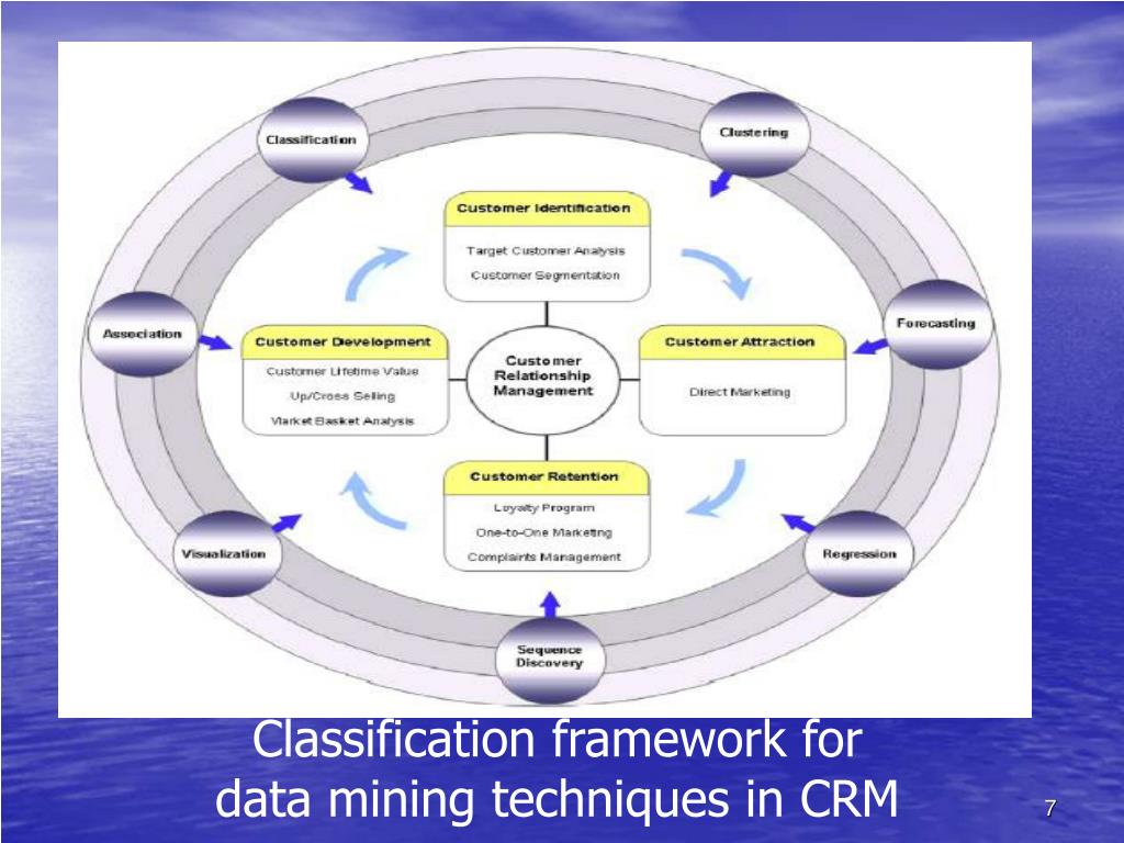 Classification framework data mining models • (1) Association. • (2) Classification. • (3) Clustering. • (4) Forecasting. • (5) Regression. • (6) Sequence discovery. • (7) Visualization.