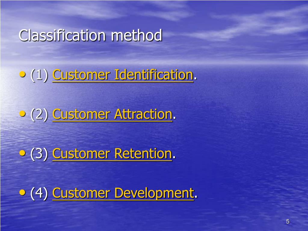 Classification method • (1) Customer Identification. • (2) Customer Attraction. • (3) Customer Retention. • (4) Customer Development.