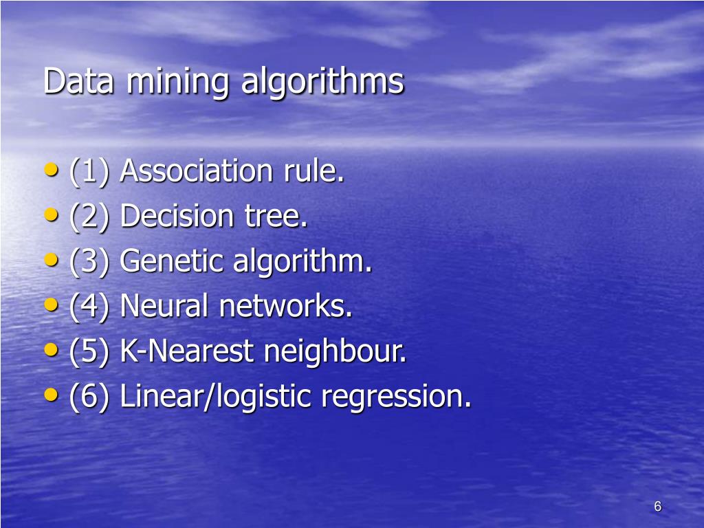Data mining algorithms • (1) Association rule. • (2) Decision tree. • (3) Genetic algorithm. • (4) Neural networks. • (5) K-Nearest neighbour. • (6) Linear/logistic regression.