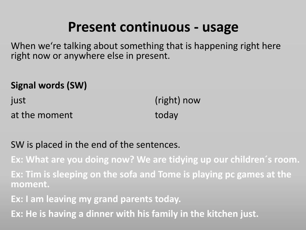 Present continuous - usage When we‘re talking about something that is happening right here right now or anywhere else in present. Signal words (SW) just (right) now at the momenttoday SW isplaced in the end ofthesentences. Ex: What are youdoingnow? We are tidying up ourchildren´sroom. Ex: Timissleeping on the sofa and Tome isplayingpcgamesatthe moment. Ex: I amleaving my grand parentstoday. Ex: He ishaving a dinnerwith his family in thekitchen just.