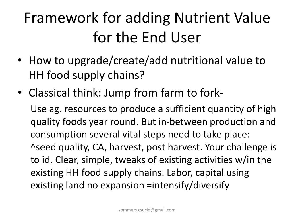 Framework for adding Nutrient Value for the End User • How to upgrade/create/add nutritional value to HH food supply chains? • Classical think: Jump from farm to fork- Use ag. resources to produce a sufficient quantity of high quality foods year round. But in-between production and consumption several vital steps need to take place: ^seed quality, CA, harvest, post harvest. Your challenge is to id. Clear, simple, tweaks of existing activities w/in the existing HH food supply chains. Labor, capital using existing land no expansion =intensify/diversify sommers.csucid@gmail.com
