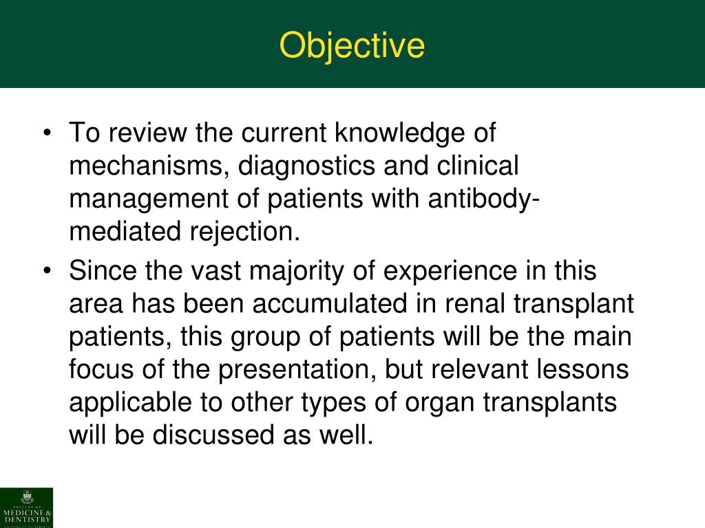 Objective • To review the current knowledge of mechanisms, diagnostics and clinical management of patients with antibody-mediated rejection. • Since the vast majority of experience in this area has been accumulated in renal transplant patients, this group of patients will be the main focus of the presentation, but relevant lessons applicable to other types of organ transplants will be discussed as well.