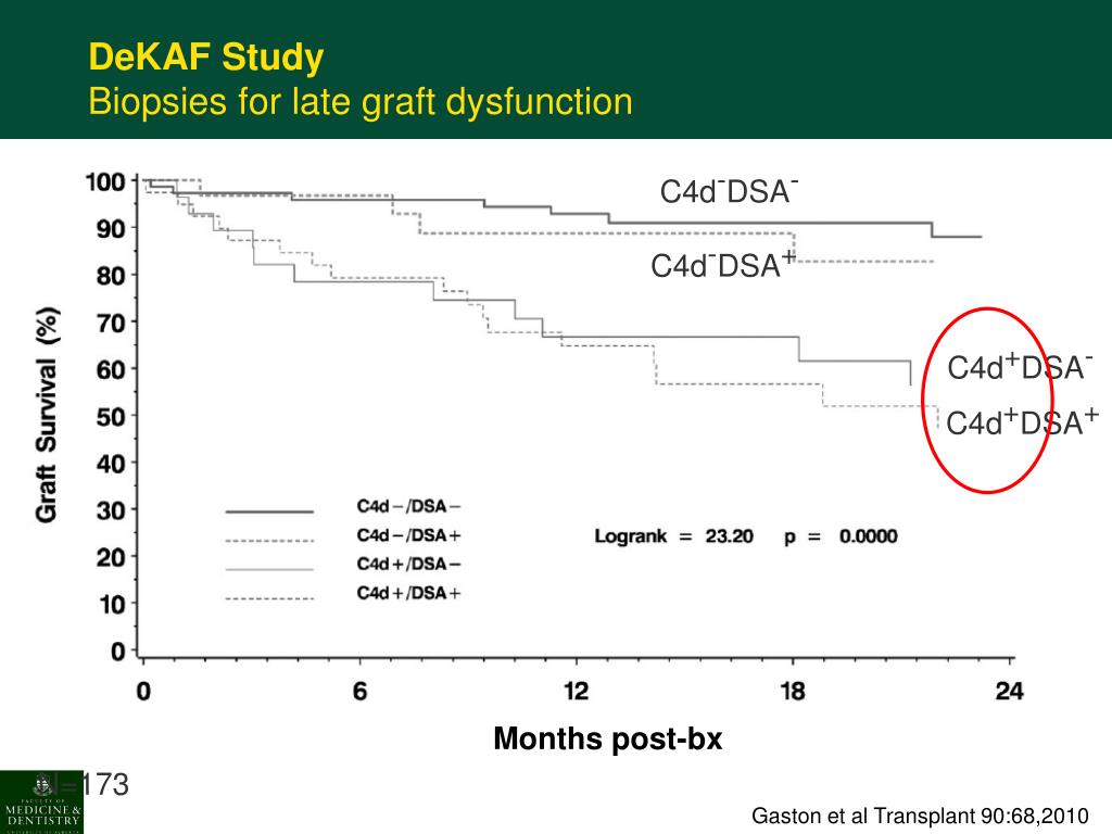 DeKAFStudy Biopsies for late graft dysfunction C4d-DSA- C4d-DSA+ C4d+DSA- C4d+DSA+ Months post-bx N=173 Gaston et al Transplant 90:68,2010