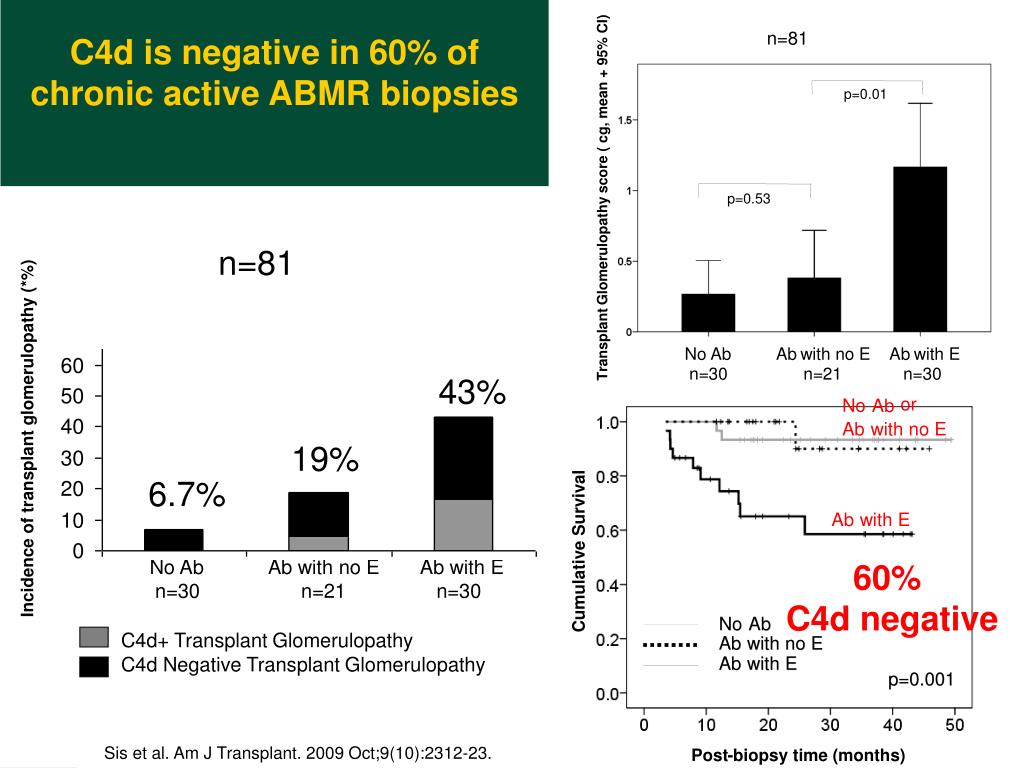 Potential causes for C4d negativity Complement activation Complement dependent cell injury Endothelial activation Recruitment and activation of leukocytes C4d+ ABMR Is C4d deposited in low amounts (Thus not detectable by current methods) Treatment effects? ? C4d negative ABMR ? Do HLA antibodies in a complement-independent way cause EC activation and subsequent inflammation and Fc receptor mediated graft injury?