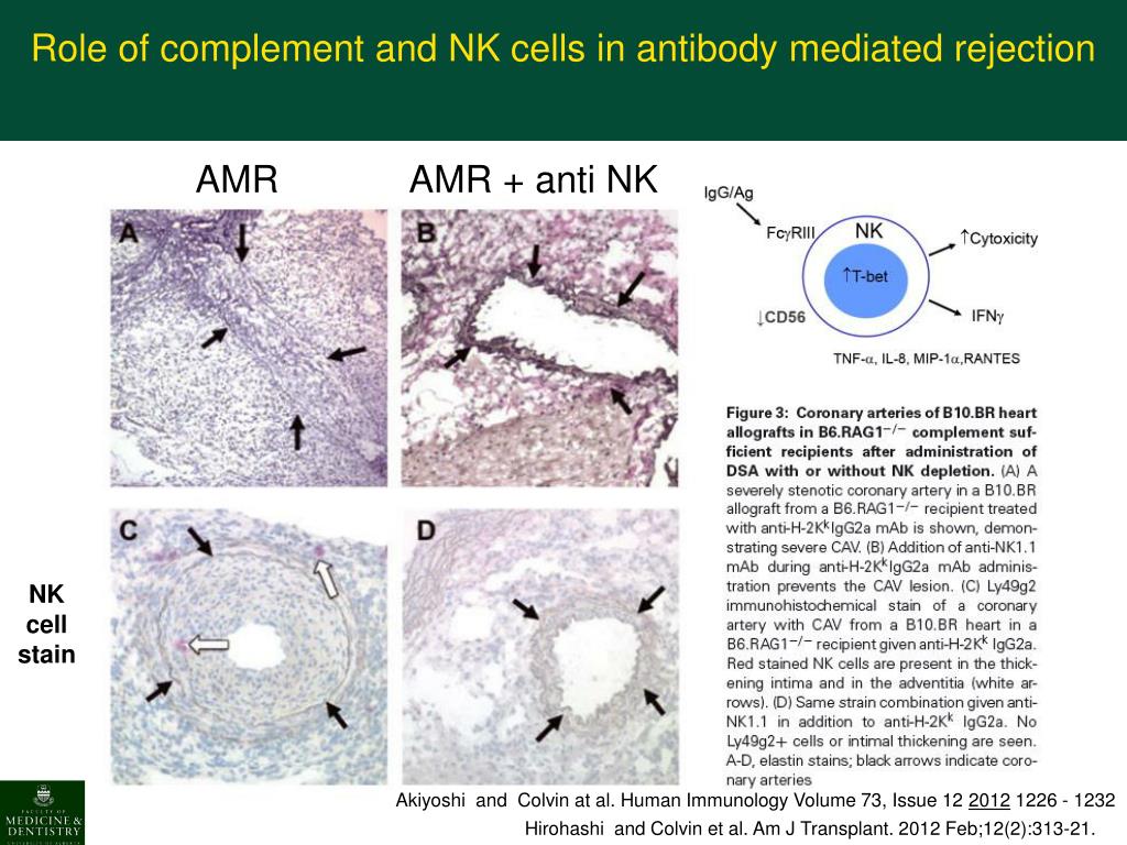 Role of complement and NK cells in antibody mediated rejection AMR AMR + anti NK NK cell stain Akiyoshi and Colvin at al. Human Immunology Volume 73, Issue 12 2012 1226 - 1232 Hirohashi and Colvin et al. Am J Transplant. 2012 Feb;12(2):313-21.