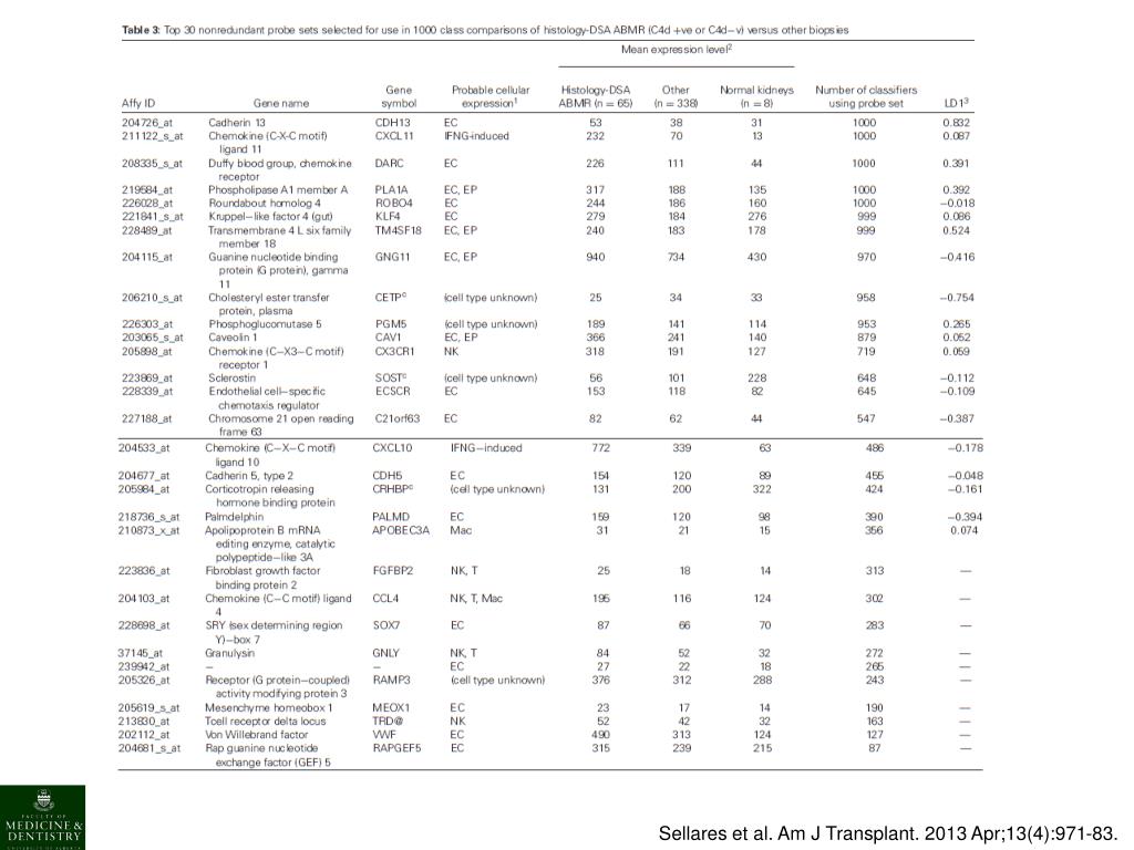 A molecular classifier for diagnosing AMR • Classifier score correlates with: • Pathology (ptc, g, cg, I, cv, ah, ct, ci) • Consensus amongst pathologists • Presence of DSA • outcome Sellares et al. Am J Transplant. 2013 Apr;13(4):971-83.