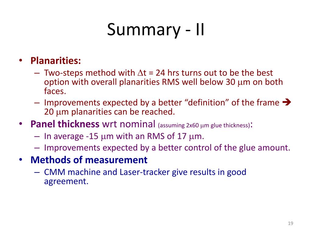 Summary - II • Planarities: • Two-stepsmethodwith Dt = 24 hrsturns out to be the best option with overallplanarities RMS wellbelow 30 mm on bothfaces. • Improvementsexpected by a better “definition” of the frame 20 mm planarities can be reached. • Panel thicknesswrtnominal(assuming2x60 mm gluethickness): • In average -15 mm with an RMS of 17 mm. • Improvementsexpectedby a bettercontrolof the glueamount. • Methods of measurement • CMM machine and Laser-trackergiveresults in good agreement.