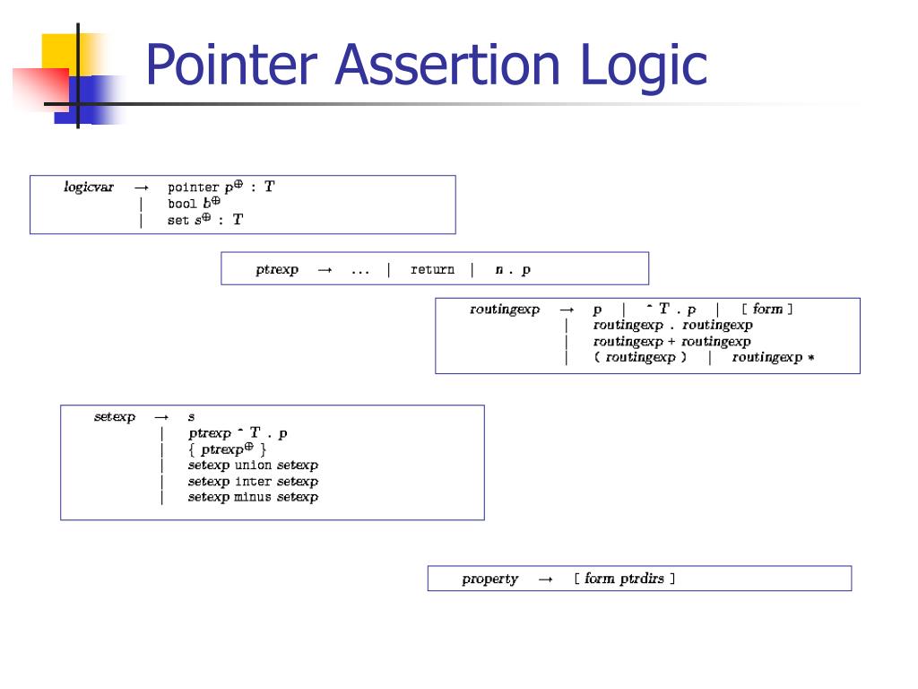 tree-shaped data struct + extra pointers data pointers: backbone pointer fields: conditions Other Examples: doubly-linked cyclic list binary trees binary trees in which all the leaves are joined in a cyclic list red - black trees :) and so on... Example I: List with pointer to the last element: type Head = { data first: Node; pointer last: Node[this.first<next*.[pos.next=null]>last]; } type Node = { data next: Node; } Example II: Binary tree with cyclic post order pointers: type Node = { data left,right:Node; pointer post:Node[POST(this,post)]; pointer parent:Node[PARENT(this,parent)]; } Graph types example