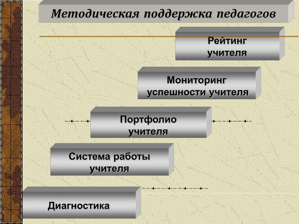 Методическая поддержка педагогов Рейтинг учителя Мониторинг успешности учителя Портфолио учителя Система работы учителя Диагностика