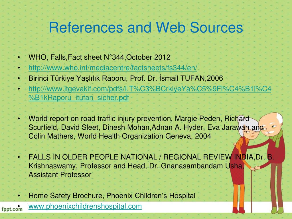 References and Web Sources • WHO, Falls,Fact sheet N°344,October 2012 • http://www.who.int/mediacentre/factsheets/fs344/en/ • Birinci Türkiye Yaşlılık Raporu, Prof. Dr. İsmail TUFAN,2006 • http://www.itgevakif.com/pdfs/I.T%C3%BCrkiyeYa%C5%9Fl%C4%B1l%C4%B1kRaporu_itufan_sicher.pdf • World report on road traffic injury prevention, Margie Peden, Richard Scurfield, David Sleet, Dinesh Mohan,Adnan A. Hyder, Eva Jarawan and Colin Mathers, World Health Organization Geneva, 2004 • FALLS IN OLDER PEOPLE NATIONAL / REGIONAL REVIEW INDIA,Dr. B. Krishnaswamy, Professor and Head, Dr. Gnanasambandam Usha, Assistant Professor • Home Safety Brochure, Phoenix Children’s Hospital • www.phoenixchildrenshospital.com