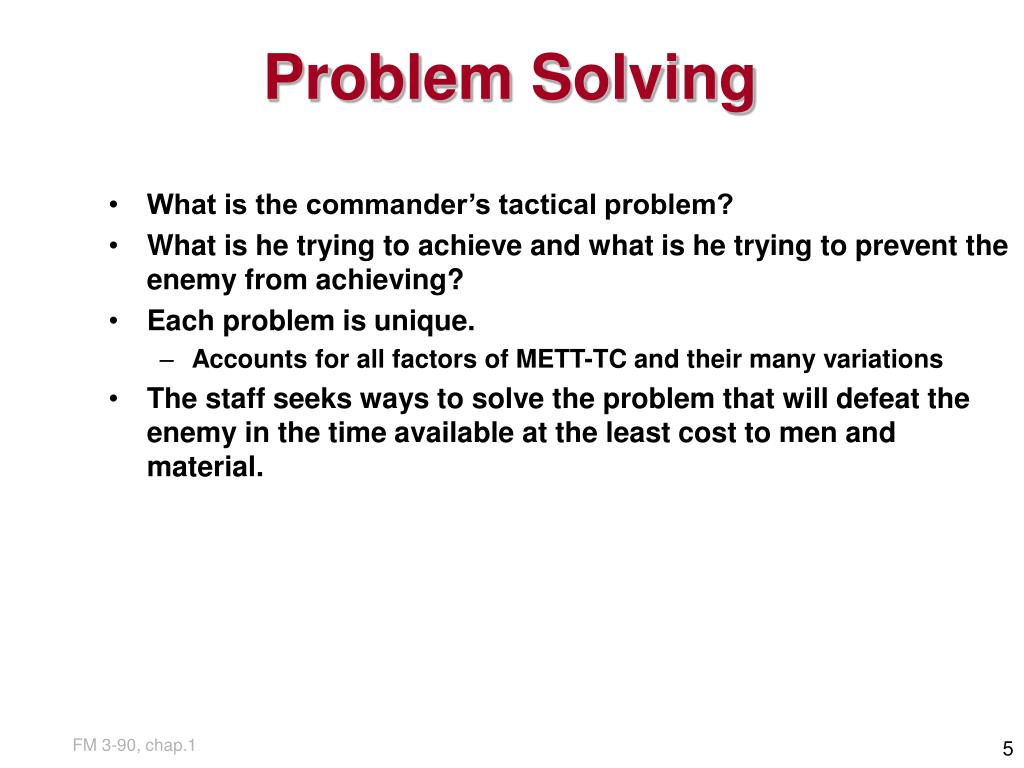 Problem Solving • What is the commander’s tactical problem? • What is he trying to achieve and what is he trying to prevent the enemy from achieving? • Each problem is unique. • Accounts for all factors of METT-TC and their many variations • The staff seeks ways to solve the problem that will defeat the enemy in the time available at the least cost to men and material. FM 3-90, chap.1