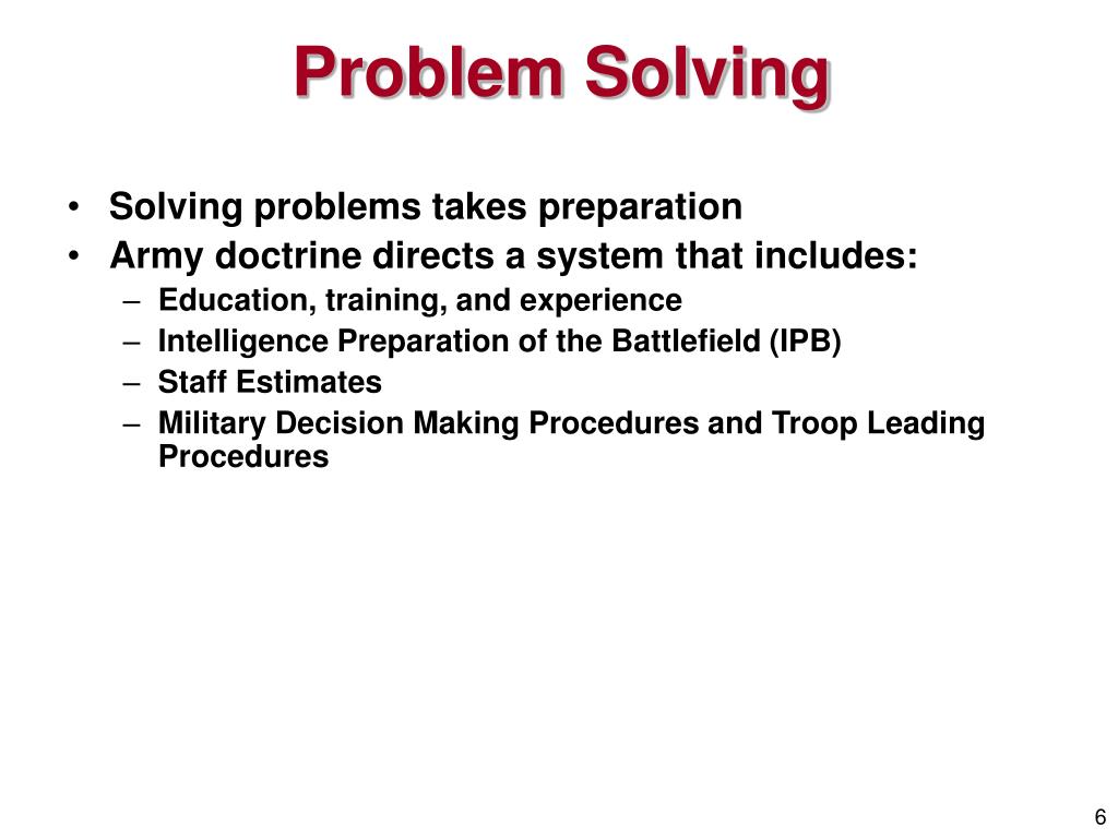 Problem Solving • Solving problems takes preparation • Army doctrine directs a system that includes: • Education, training, and experience • Intelligence Preparation of the Battlefield (IPB) • Staff Estimates • Military Decision Making Procedures and Troop Leading Procedures