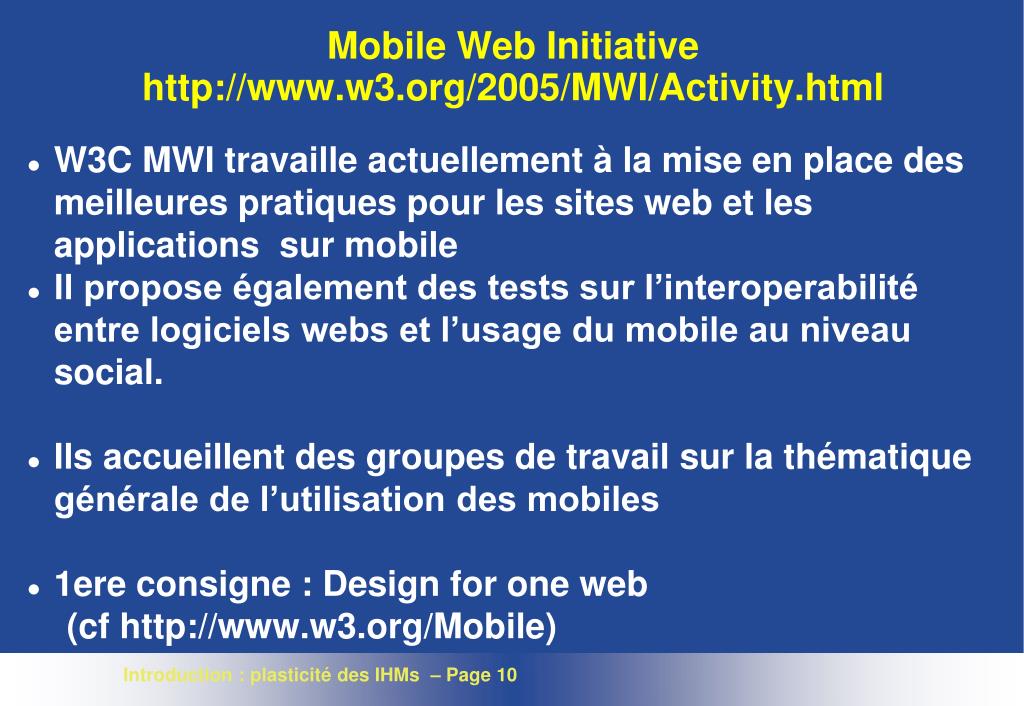 Mobile Web Initiativehttp://www.w3.org/2005/MWI/Activity.html • W3C MWI travaille actuellement à la mise en place des meilleures pratiques pour les sites web et les applications sur mobile • Il propose également des tests sur l’interoperabilité entre logiciels webs et l’usage du mobile au niveau social. • Ils accueillent des groupes de travail sur la thématique générale de l’utilisation des mobiles • 1ere consigne : Design for one web (cf http://www.w3.org/Mobile)