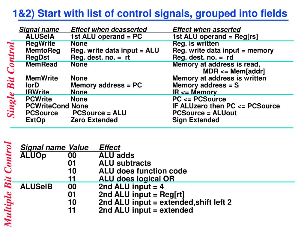 1&2) Start with list of control signals, grouped into fields Signal name Effect when deasserted Effect when assertedALUSelA 1st ALU operand = PC 1st ALU operand = Reg[rs]RegWrite None Reg. is written MemtoReg Reg. write data input = ALU Reg. write data input = memory RegDst Reg. dest. no. = rt Reg. dest. no. = rdMemRead None Memory at address is read, MDR <= Mem[addr]MemWrite None Memory at address is written IorD Memory address = PC Memory address = SIRWrite None IR <= MemoryPCWrite None PC <= PCSourcePCWriteCond None IF ALUzero then PC <= PCSourcePCSource PCSource = ALU PCSource = ALUoutExtOp Zero Extended Sign Extended Single Bit Control Signal name Value EffectALUOp 00 ALU adds 01 ALU subtracts 10 ALU does function code 11 ALU does logical OR ALUSelB 00 2nd ALU input = 4 01 2nd ALU input = Reg[rt] 10 2nd ALU input = extended,shift left 2 11 2nd ALU input = extended Multiple Bit Control