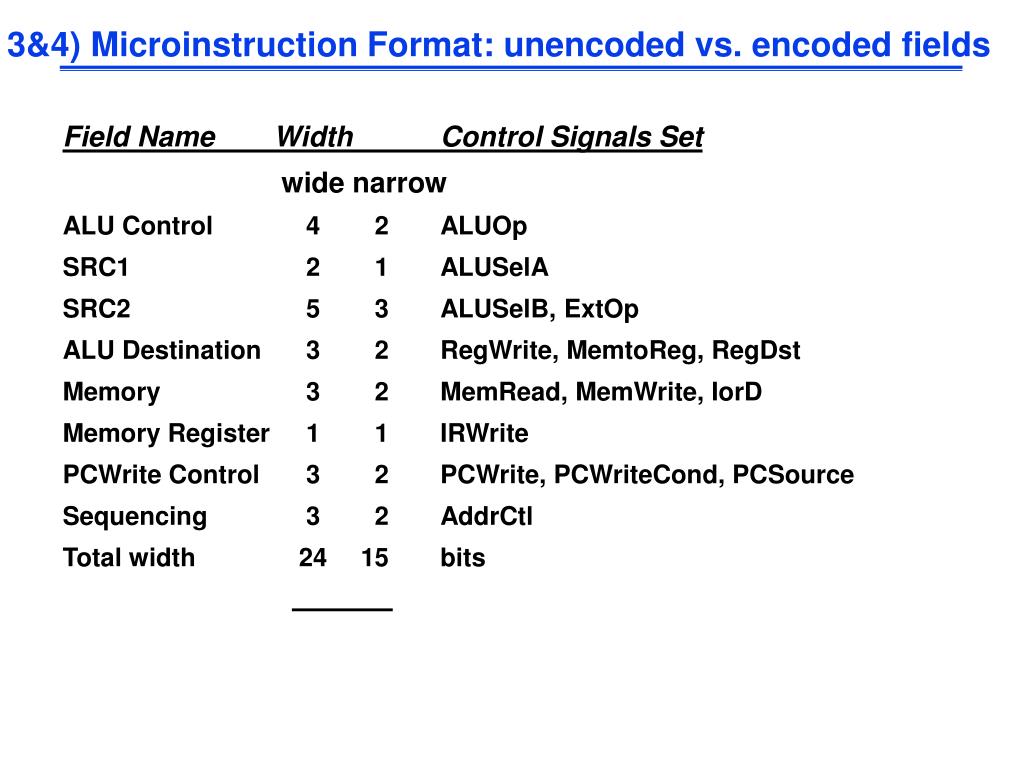 3&4) Microinstruction Format: unencoded vs. encoded fields Field Name Width Control Signals Set wide narrow ALU Control 4 2 ALUOp SRC1 2 1 ALUSelA SRC2 5 3 ALUSelB, ExtOp ALU Destination 3 2 RegWrite, MemtoReg, RegDst Memory 3 2 MemRead, MemWrite, IorD Memory Register 1 1 IRWrite PCWrite Control 3 2 PCWrite, PCWriteCond, PCSource Sequencing 3 2 AddrCtl Total width 24 15 bits