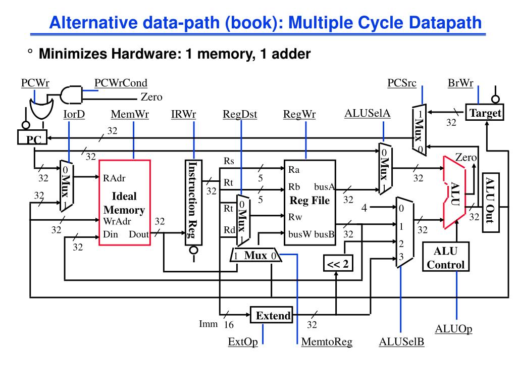 Recap: A Single Cycle Datapath Instruction<31:0> nPC_sel Instruction Fetch Unit Rd Rt <21:25> <16:20> <11:15> <0:15> Clk RegDst 1 0 Mux Rs Rt Rd Imm16 Rs Rt RegWr ALUctr 5 5 5 MemtoReg busA Equal MemWr Rw Ra Rb busW 32 32 32-bit Registers 0 ALU 32 busB 32 0 Clk Mux 32 Mux 32 1 WrEn Adr 1 Data In 32 Data Memory Extender imm16 32 16 Clk ALUSrc ExtOp