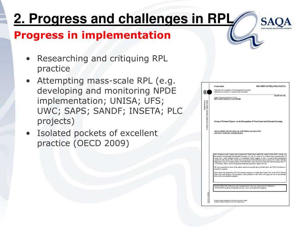 Progress in implementation 2. Progress and challenges in RPL • Researching and critiquing RPL practice • Attempting mass-scale RPL (e.g. developing and monitoring NPDE implementation; UNISA; UFS; UWC; SAPS; SANDF; INSETA; PLC projects) • Isolated pockets of excellent practice (OECD 2009)