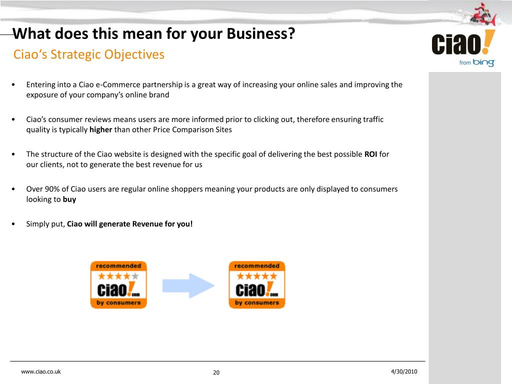 Ciao Reviews • “86% of consumers always read online reviews before making purchasing decisions.” (Kudzu.com survey of 600 users, December 2008) • “The majority of UK Ciao users are looking for opinions on products and services.” Ciao: Brand Positioning And Reasons For Use” Facit, 2009 • “94% of Ciao users read online review before making purchasing decisions” Ciao: Brand Positioning And Reasons For Use” Facit, 2009 www.ciao.group.com www.ciao.co.uk