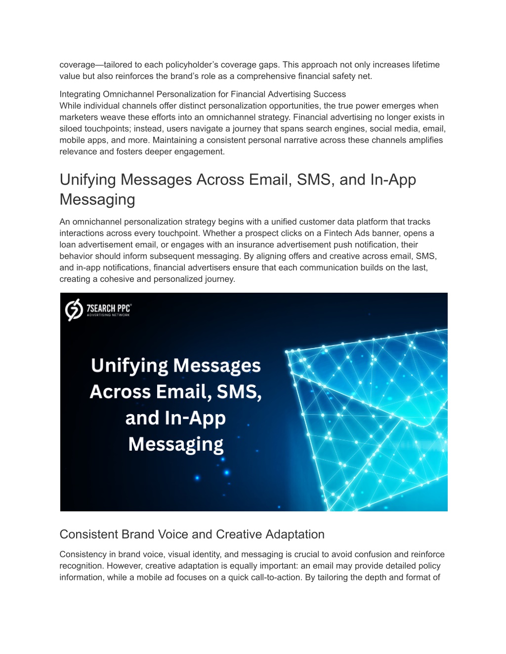 coverage—tailored to each policyholder’s coverage gaps. This approach not only increases lifetime value but also reinforces the brand’s role as a comprehensive financial safety net. Integrating Omnichannel Personalization for Financial Advertising Success While individual channels offer distinct personalization opportunities, the true power emerges when marketers weave these efforts into an omnichannel strategy. Financial advertising no longer exists in siloed touchpoints; instead, users navigate a journey that spans search engines, social media, email, mobile apps, and more. Maintaining a consistent personal narrative across these channels amplifies relevance and fosters deeper engagement. Unifying Messages Across Email, SMS, and In-App Messaging An omnichannel personalization strategy begins with a unified customer data platform that tracks interactions across every touchpoint. Whether a prospect clicks on a Fintech Ads banner, opens a loan advertisement email, or engages with an insurance advertisement push notification, their behavior should inform subsequent messaging. By aligning offers and creative across email, SMS, and in-app notifications, financial advertisers ensure that each communication builds on the last, creating a cohesive and personalized journey. Consistent Brand Voice and Creative Adaptation Consistency in brand voice, visual identity, and messaging is crucial to avoid confusion and reinforce recognition. However, creative adaptation is equally important: an email may provide detailed policy information, while a mobile ad focuses on a quick call-to-action. By tailoring the depth and format of