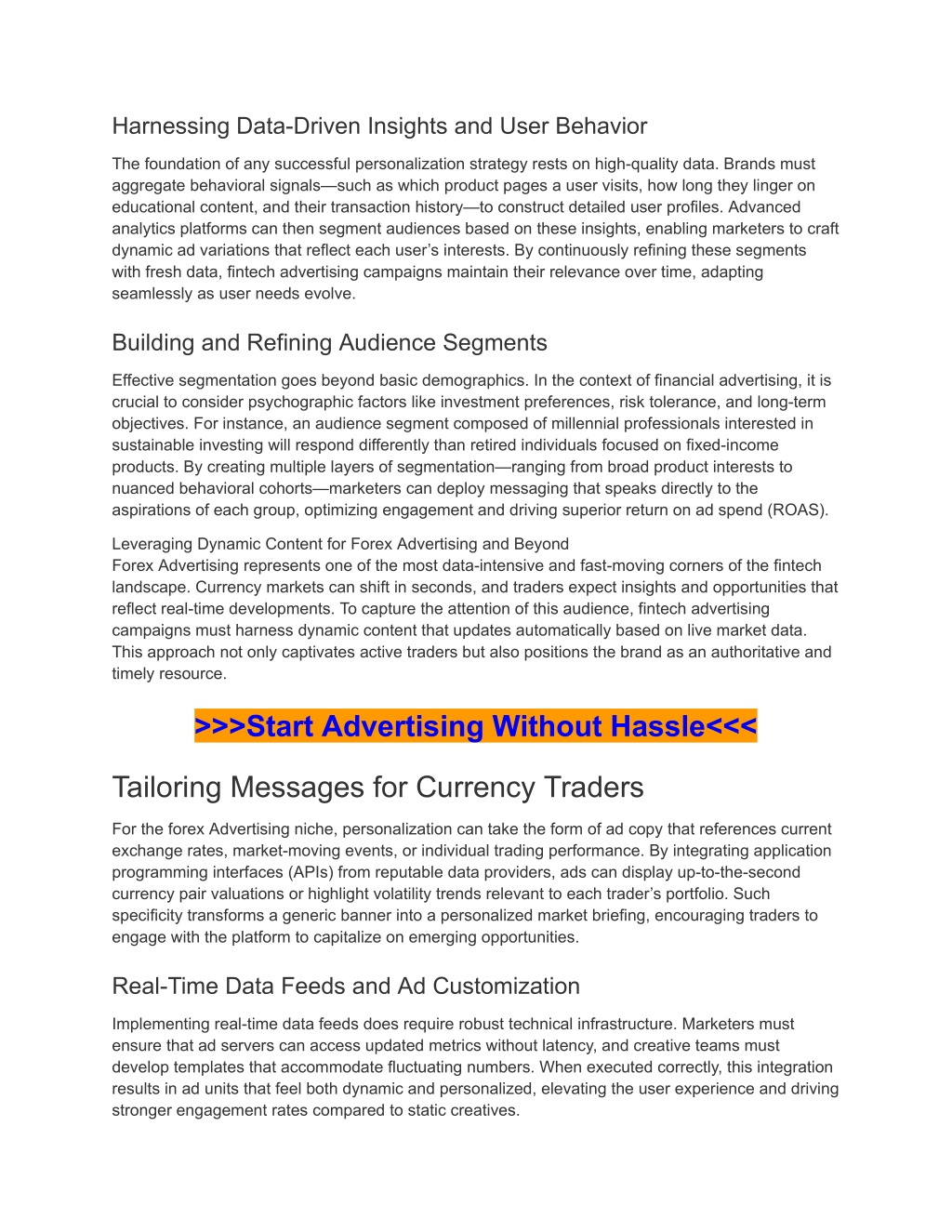 Harnessing Data-Driven Insights and User Behavior The foundation of any successful personalization strategy rests on high-quality data. Brands must aggregate behavioral signals—such as which product pages a user visits, how long they linger on educational content, and their transaction history—to construct detailed user profiles. Advanced analytics platforms can then segment audiences based on these insights, enabling marketers to craft dynamic ad variations that reflect each user’s interests. By continuously refining these segments with fresh data, fintech advertising campaigns maintain their relevance over time, adapting seamlessly as user needs evolve. Building and Refining Audience Segments Effective segmentation goes beyond basic demographics. In the context of financial advertising, it is crucial to consider psychographic factors like investment preferences, risk tolerance, and long-term objectives. For instance, an audience segment composed of millennial professionals interested in sustainable investing will respond differently than retired individuals focused on fixed-income products. By creating multiple layers of segmentation—ranging from broad product interests to nuanced behavioral cohorts—marketers can deploy messaging that speaks directly to the aspirations of each group, optimizing engagement and driving superior return on ad spend (ROAS). Leveraging Dynamic Content for Forex Advertising and Beyond Forex Advertising represents one of the most data-intensive and fast-moving corners of the fintech landscape. Currency markets can shift in seconds, and traders expect insights and opportunities that reflect real-time developments. To capture the attention of this audience, fintech advertising campaigns must harness dynamic content that updates automatically based on live market data. This approach not only captivates active traders but also positions the brand as an authoritative and timely resource. >>>Start Advertising Without Hassle<<< Tailoring Messages for Currency Traders For the forex Advertising niche, personalization can take the form of ad copy that references current exchange rates, market-moving events, or individual trading performance. By integrating application programming interfaces (APIs) from reputable data providers, ads can display up-to-the-second currency pair valuations or highlight volatility trends relevant to each trader’s portfolio. Such specificity transforms a generic banner into a personalized market briefing, encouraging traders to engage with the platform to capitalize on emerging opportunities. Real-Time Data Feeds and Ad Customization Implementing real-time data feeds does require robust technical infrastructure. Marketers must ensure that ad servers can access updated metrics without latency, and creative teams must develop templates that accommodate fluctuating numbers. When executed correctly, this integration results in ad units that feel both dynamic and personalized, elevating the user experience and driving stronger engagement rates compared to static creatives.
