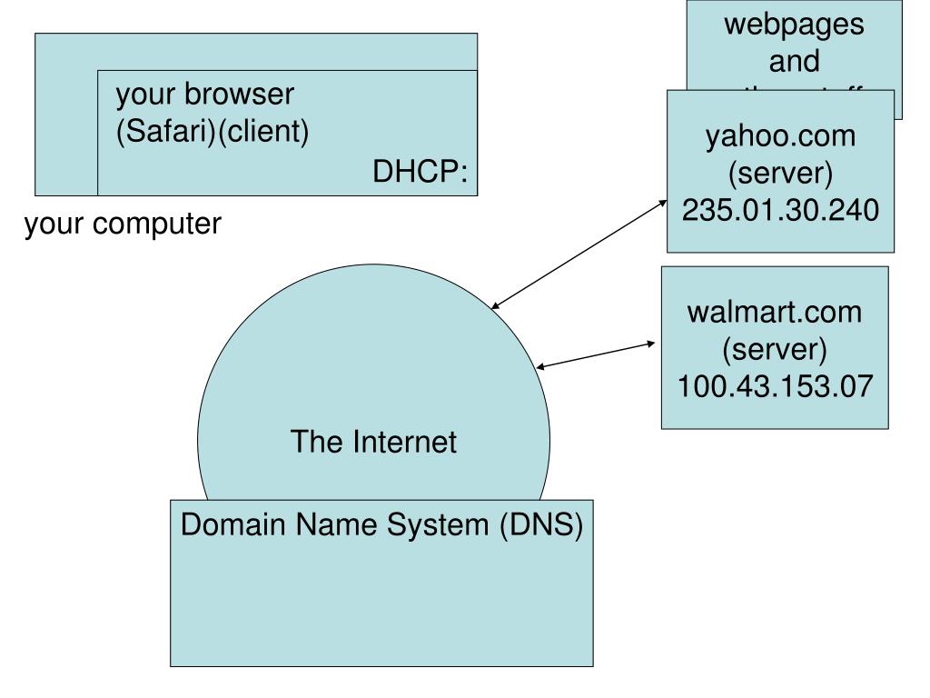 webpages and other stuff DHCP: your browser (Safari)(client) yahoo.com (server) 235.01.30.240 your computer The Internet walmart.com (server) 100.43.153.07 Domain Name System (DNS)