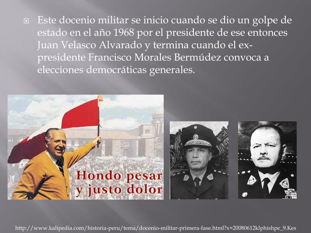 Este docenio militar se inicio cuando se dio un golpe de estado en el año 1968 por el presidente de ese entonces Juan Velasco Alvarado y termina cuando el ex-presidente Francisco Morales Bermúdez convoca a elecciones democráticas generales. http://www.kalipedia.com/historia-peru/tema/docenio-militar-primera-fase.html?x=20080612klphishpe_9.Kes