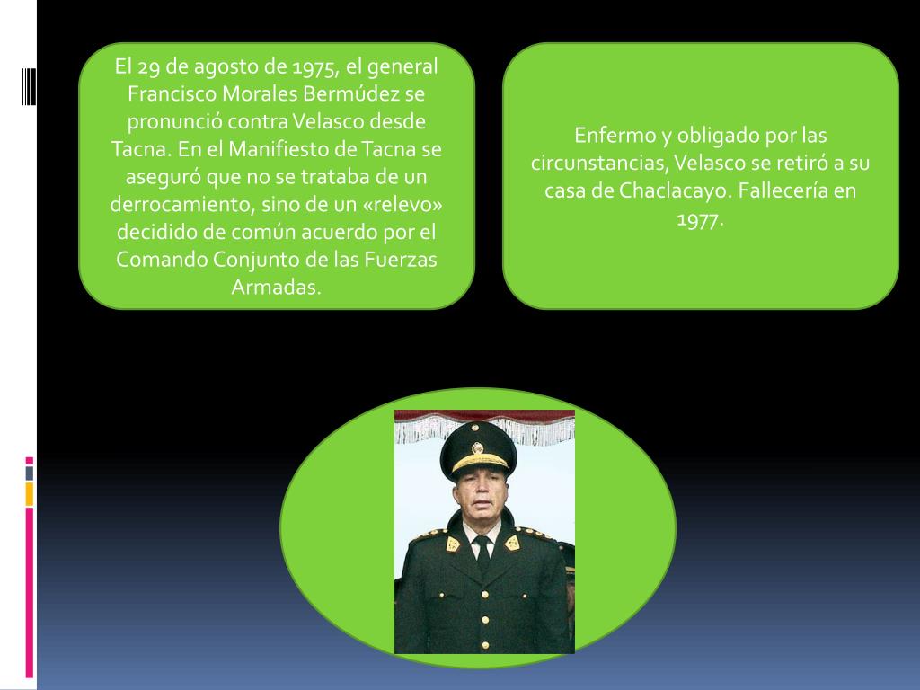La segunda fase(1975 – 1980): • En 1975, un pronunciamiento militar puso fin a la (Primera Fase) del régimen. El mando de la nación fue entonces asumido por el general Francisco Morales Bermúdez, bajo cuya batuta la “revolución peruana” siguió un curso distinto. • En la primera fase con un golpe de estado gobierna Juan Velasco Alvarado (1968 – 1975).