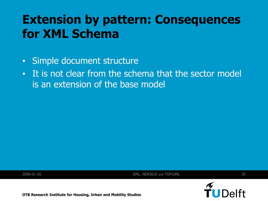 Extension by pattern: Consequences for XML Schema • Simple document structure • It is not clear from the schema that the sector model is an extension of the base model GML, NEN3610 and TOP10NL