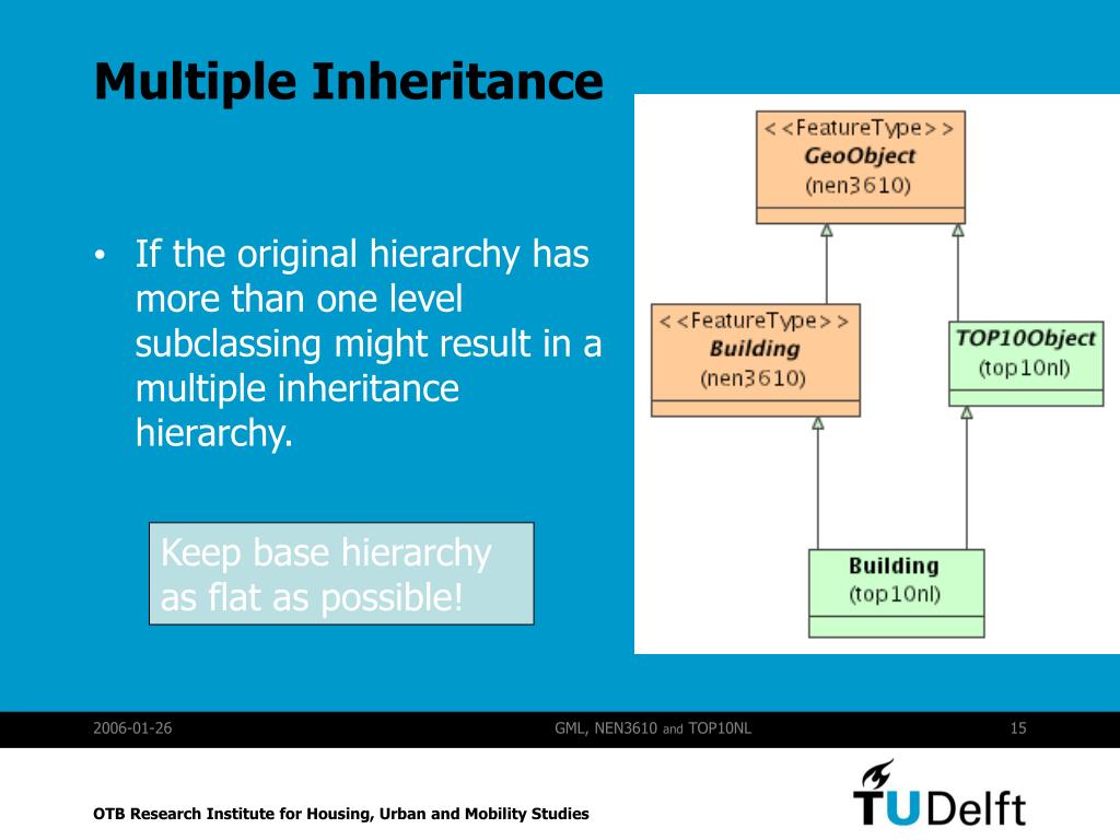 Multiple Inheritance • If the original hierarchy has more than one level subclassing might result in a multiple inheritance hierarchy. Keep base hierarchy as flat as possible! GML, NEN3610 and TOP10NL