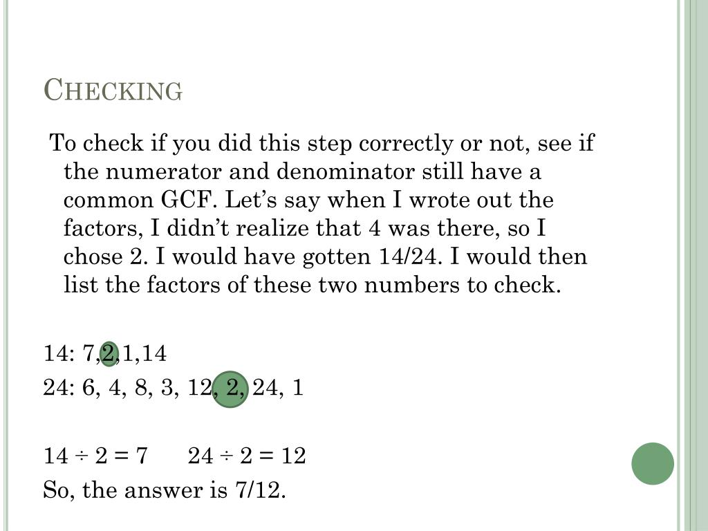 Checking To check if you did this step correctly or not, see if the numerator and denominator still have a common GCF. Let’s say when I wrote out the factors, I didn’t realize that 4 was there, so I chose 2. I would have gotten 14/24. I would then list the factors of these two numbers to check. 14: 7,2,1,14 24: 6, 4, 8, 3, 12, 2, 24, 1 14 ÷ 2 = 7 24 ÷ 2 = 12 So, the answer is 7/12.