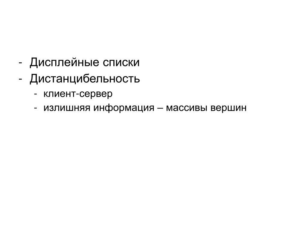 Дисплейные списки • Дистанцибельность • клиент-сервер • излишняя информация – массивы вершин
