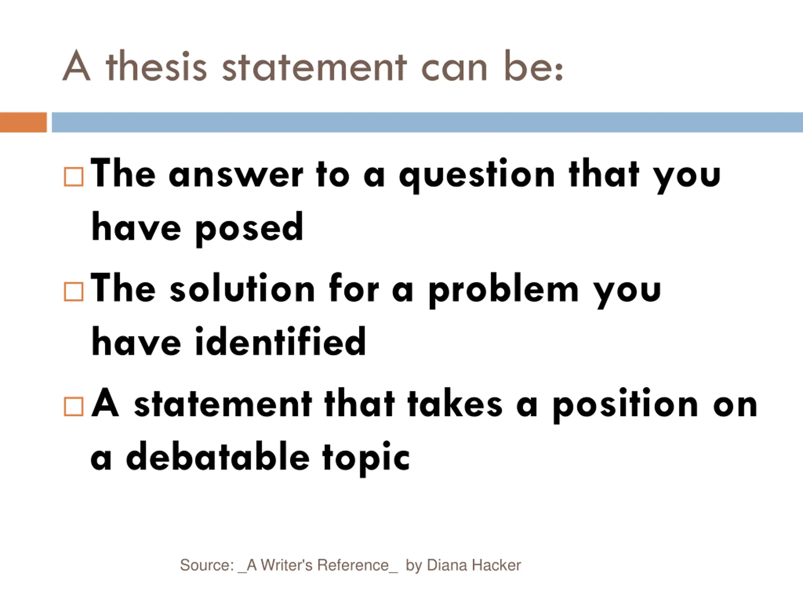 A thesis statement can be: The answer to a question that you have posed The solution for a problem you have identified A statement that takes a position on a debatable topic Source: _A Writer's Reference_ by Diana Hacker