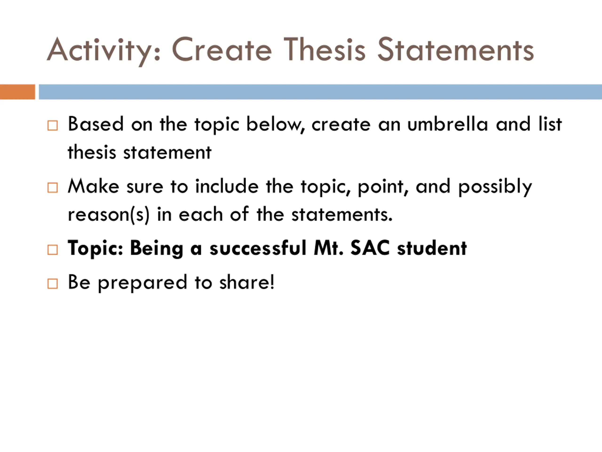 Activity: Create Thesis Statements Based on the topic below, create an umbrella and list thesis statement Make sure to include the topic, point, and possibly reason(s) in each of the statements. Topic: Being a successful Mt. SAC student Be prepared to share!