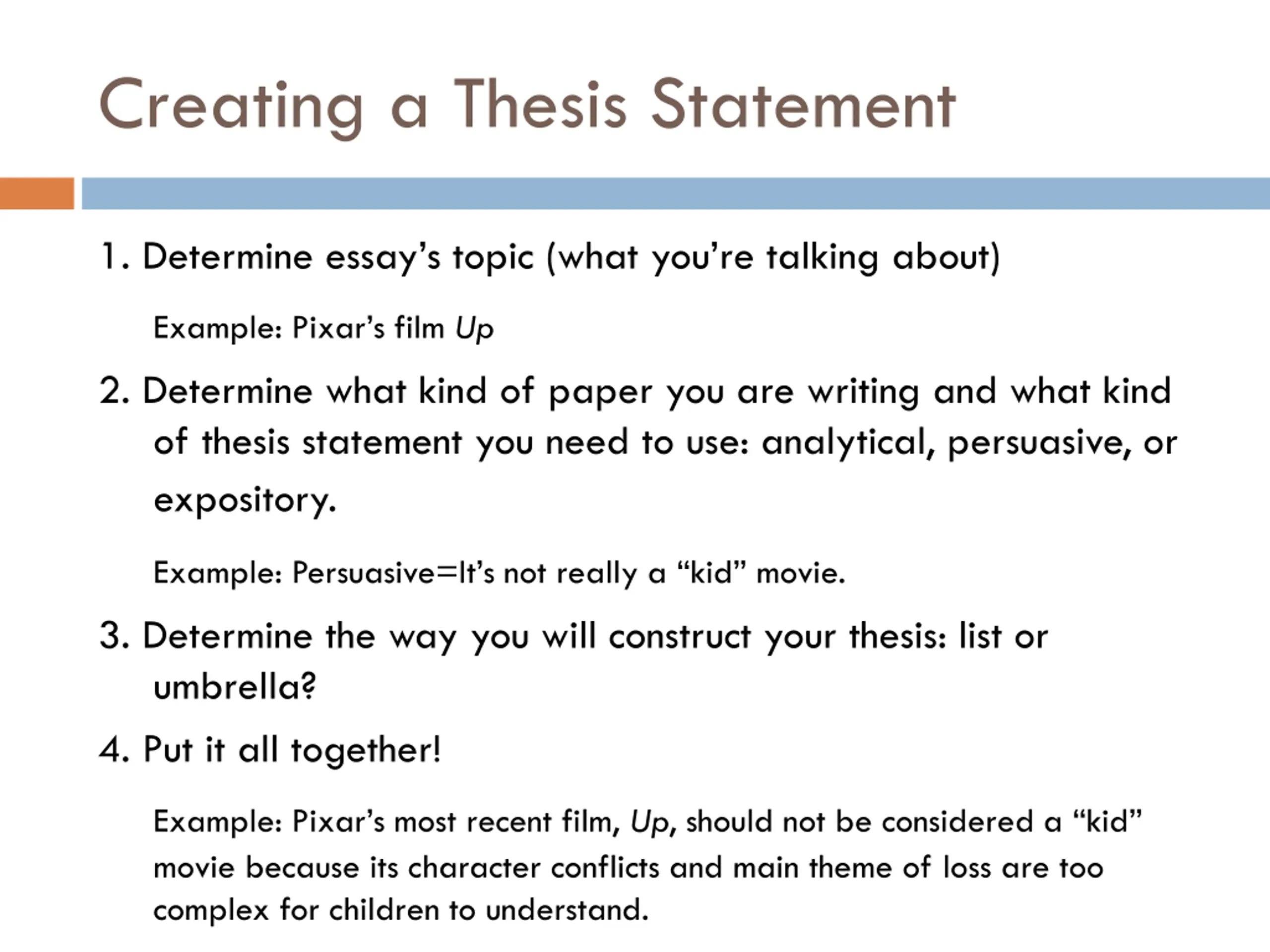 Creating a Thesis Statement 1. Determine essay’s topic (what you’re talking about) Example: Pixar’s film Up 2. Determine what kind of paper you are writing and what kind of thesis statement you need to use: analytical, persuasive, or expository. Example: Persuasive=It’s not really a “kid” movie. 3. Determine the way you will construct your thesis: list or umbrella? 4. Put it all together! Example: Pixar’s most recent film, Up, should not be considered a “kid” movie because its character conflicts and main theme of loss are too complex for children to understand.