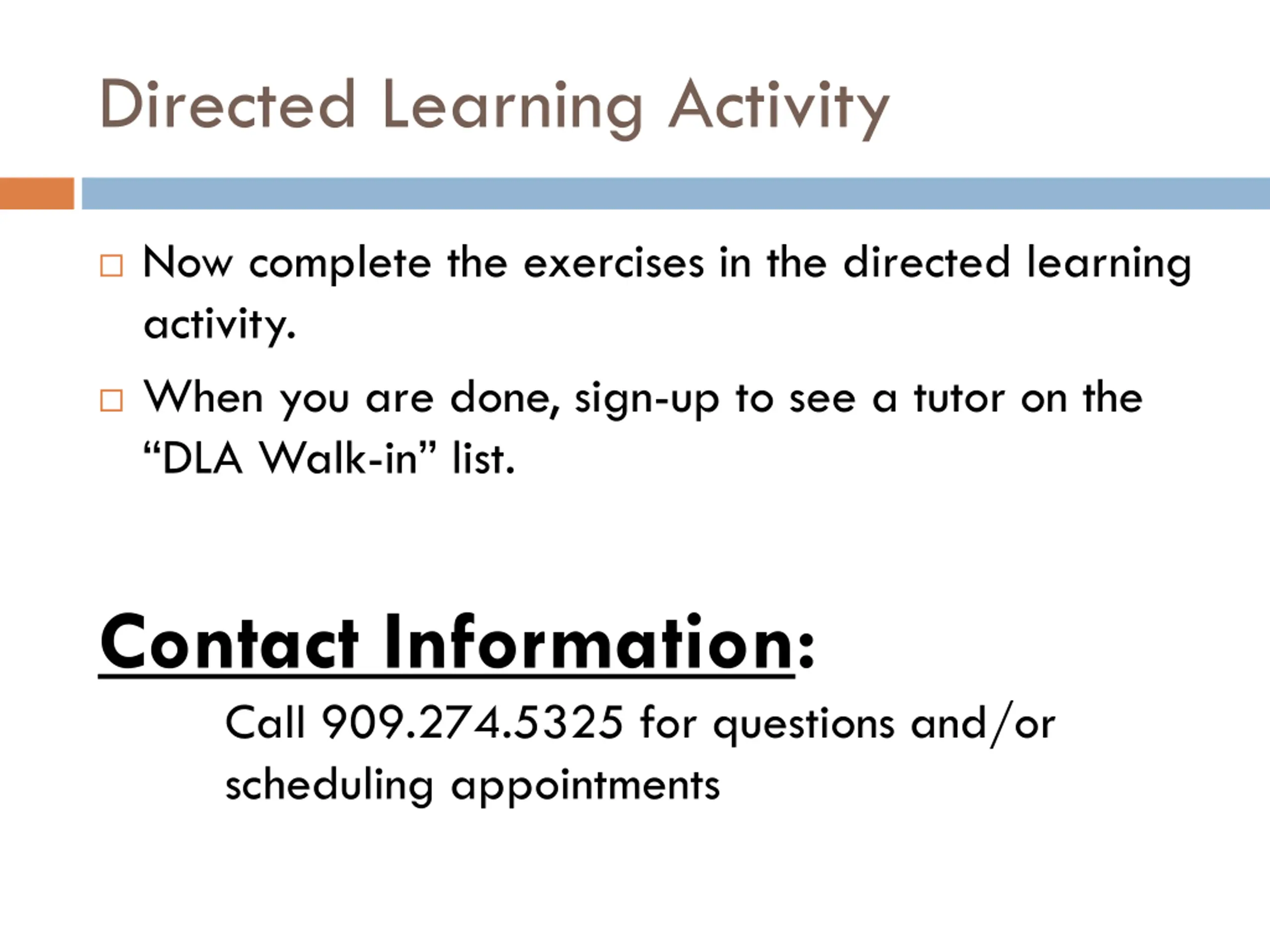 Directed Learning Activity Now complete the exercises in the directed learning activity. When you are done, sign-up to see a tutor on the “DLA Walk-in” list. Contact Information: Call 909.274.5325 for questions and/or scheduling appointments