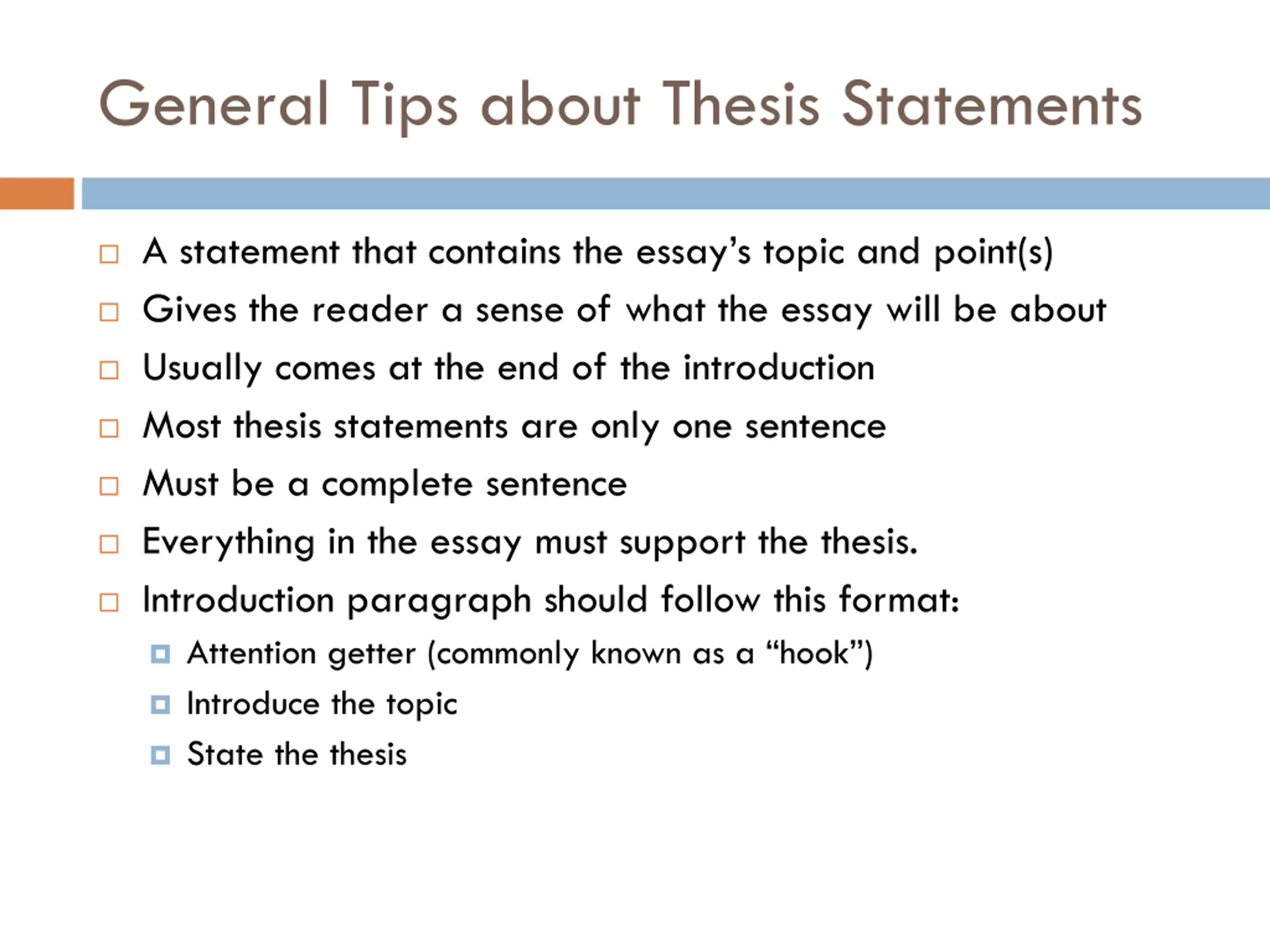 General Tips about Thesis Statements A statement that contains the essay’s topic and point(s) Gives the reader a sense of what the essay will be about Usually comes at the end of the introduction Most thesis statements are only one sentence Must be a complete sentence Everything in the essay must support the thesis. Introduction paragraph should follow this format: Attention getter (commonly known as a “hook”) Introduce the topic State the thesis