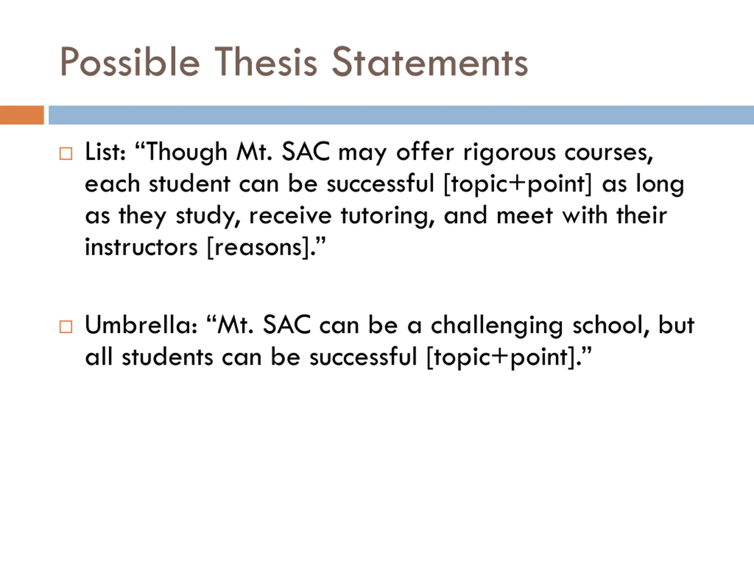 Possible Thesis Statements List: “Though Mt. SAC may offer rigorous courses, each student can be successful [topic+point] as long as they study, receive tutoring, and meet with their instructors [reasons].” Umbrella: “Mt. SAC can be a challenging school, but all students can be successful [topic+point].”