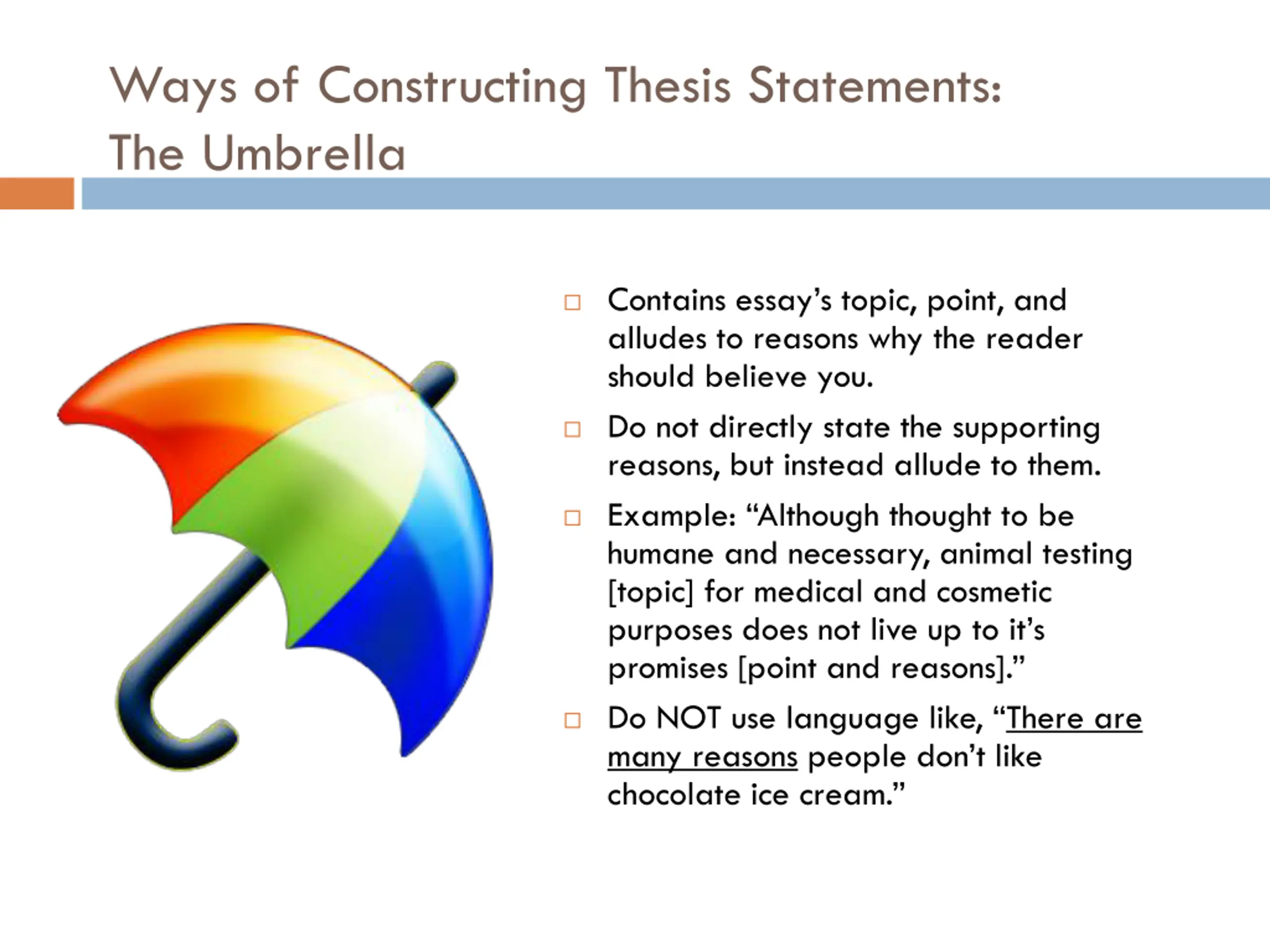Ways of Constructing Thesis Statements: The Umbrella Contains essay’s topic, point, and alludes to reasons why the reader should believe you. Do not directly state the supporting reasons, but instead allude to them. Example: “Although thought to be humane and necessary, animal testing [topic] for medical and cosmetic purposes does not live up to it’s promises [point and reasons].” Do NOT use language like, “There are many reasons people don’t like chocolate ice cream.”