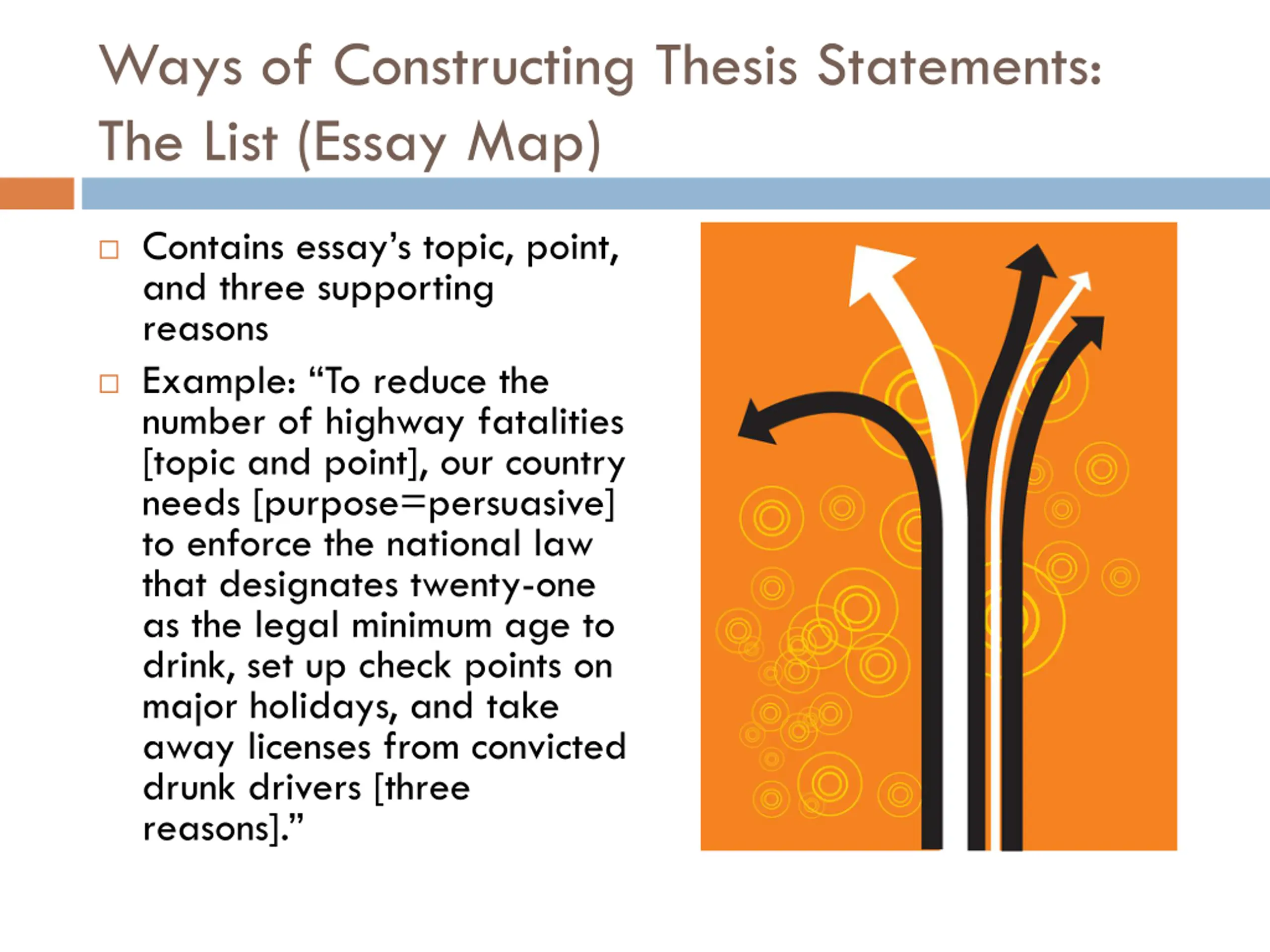 Ways of Constructing Thesis Statements: The List (Essay Map) Contains essay’s topic, point, and three supporting reasons Example: “To reduce the number of highway fatalities [topic and point], our country needs [purpose=persuasive] to enforce the national law that designates twenty-one as the legal minimum age to drink, set up check points on major holidays, and take away licenses from convicted drunk drivers [three reasons].”