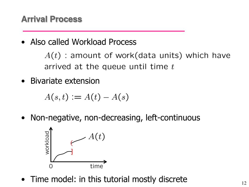 Arrival Process • Also called Workload Process • Bivariate extension • Non-negative, non-decreasing, left-continuous • Time model: in this tutorial mostly discrete
