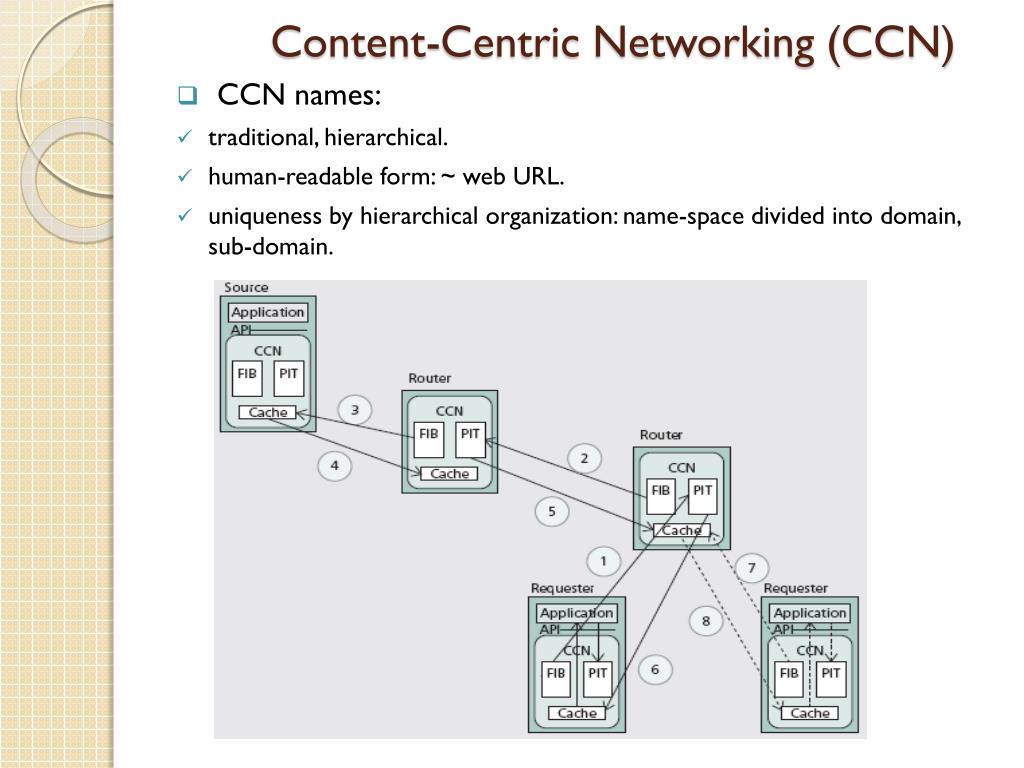 Content-Centric Networking (CCN) • CCN names: • traditional, hierarchical. • human-readable form: ~ web URL. • uniqueness by hierarchical organization: name-space divided into domain, sub-domain.